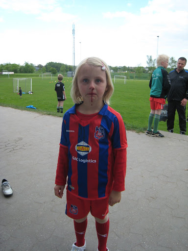 Hun tog det meget pænt, og var allerede holdt op med at græde, da hun kom ud på sidelinien til farmand. "Det var et uheld, sådan noget sker til fodbold" sagde hun. Og så gik hun ellers hele vejen til klubhuset og blødte. Det kom på græsset, på fliserne og sågar på gulvet i klubhuset.Men hun blev ikke helt afskrækket. Hun vil gerne til fodbold igen. Så det prøver vi på mandag.