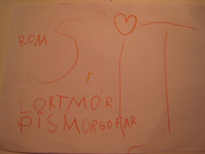Til tider får hun så lektier for, og får dermed chancen for at øve sig i nogle lidt mindre obskøne vendinger. Her har hun skrevet med børneskrift/børnestavning.